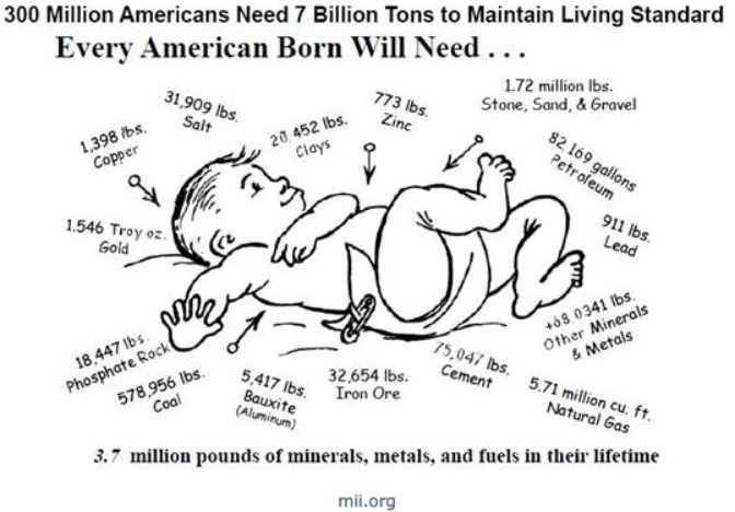 Another 2.1 billion people will be added to the world between now and 2050. Most will not be Americans but they are going to want a lot of things that we in the Western developed world take for granted – electricity, plumbing, appliances, AC etc. What if all these new consumers were to start consuming, over the next 10 years, just like an American? What’s going to happen to the world’s mineral resources if a billion more “Americans” are added to the consuming class? Here’s what each of them would need to consume, per year, to live the American lifestyle…