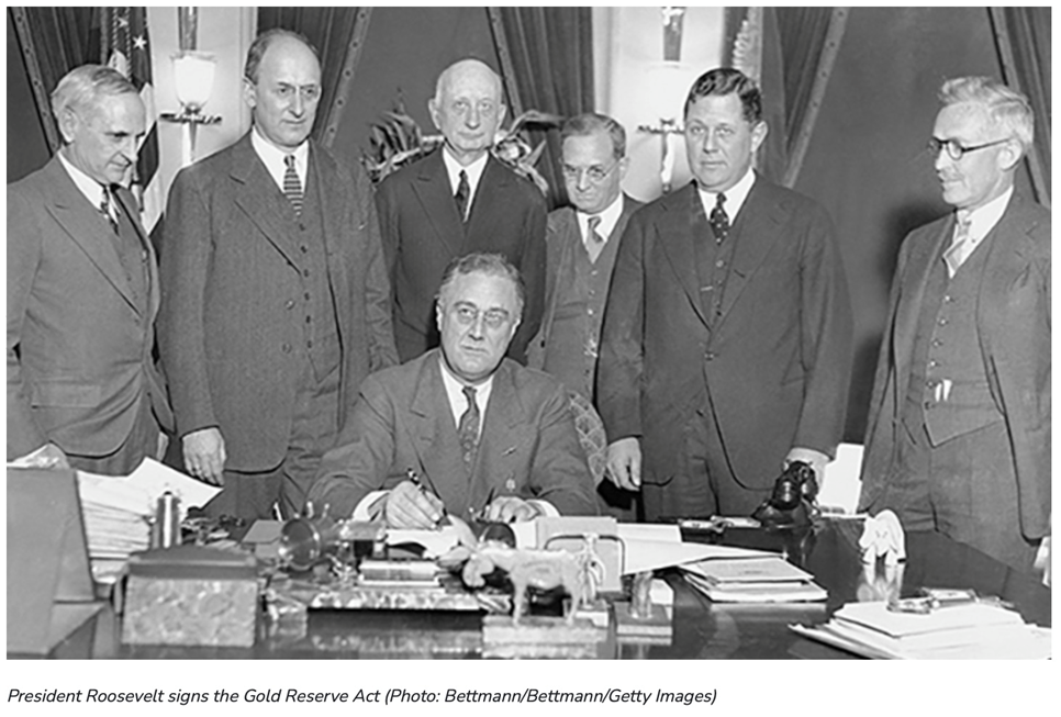 Early the next year, Roosevelt signed the Gold Reserve Act into law, which transferred ownership of US gold from the Federal Reserve System to the US Treasury.