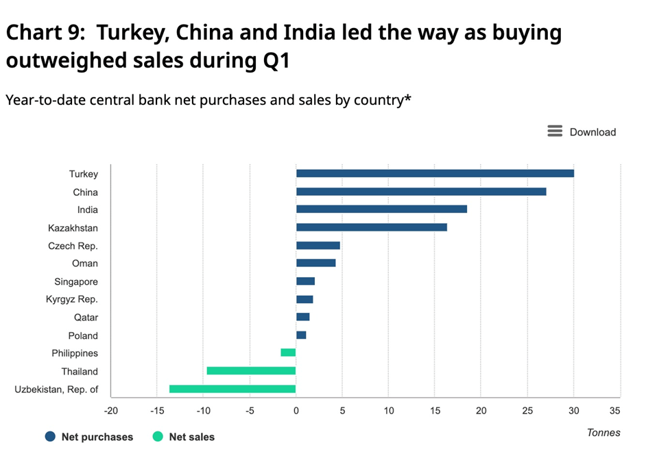 The Central Bank of Turkey has accumulated gold for 10 consecutive months, purchasing 30t during Q1 and bringing its reserves to 570t.