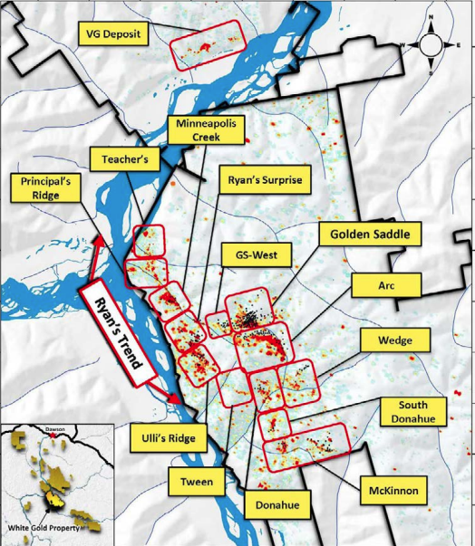 White Gold is the largest landholder in the Klondike Gold District of the Yukon, with a portfolio of 15,364 quartz claims across 21 properties, covering approximately 30,000 hectares or 3,000 square kilometers.