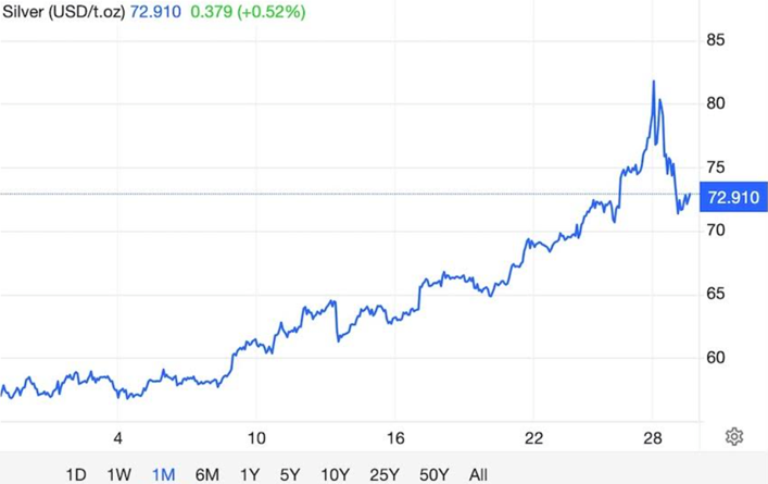 Hamilton wrote earlier this month that silver reached a near-parabola, referring to the upside-down U-shaped curve in geometry. You can see what Hamilton means in the below one-month silver chart.