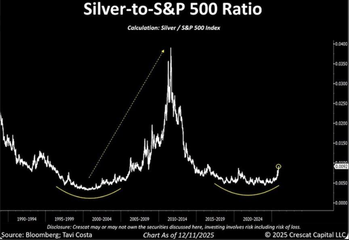 Crescat Capital’s Tavi Costa says “This is the year silver stepped firmly into the leadership position it has historically taken during powerful, long-term bull markets,” posting on X a silver-to-S&P 500 ratio chart that in his opinion is a clear blueprint to the path ahead.