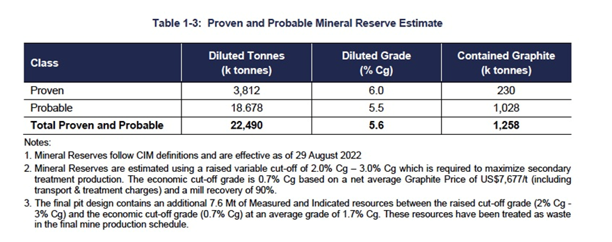 The deposit has proven and probable reserves of 22,490,000 (diluted) tonnes at grade of 5.6% Cg, yielding 1,258,000 tonnes of contained graphite.
