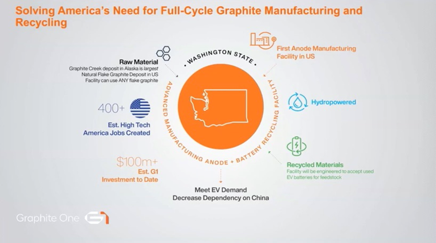 G1 plans to simultaneously develop a battery anode materials manufacturing facility in Washington State and the Graphite Creek mine in Alaska. These are the first two parts of its strategy, known forthwith as the Graphite One Project.