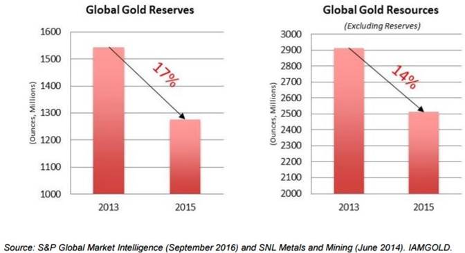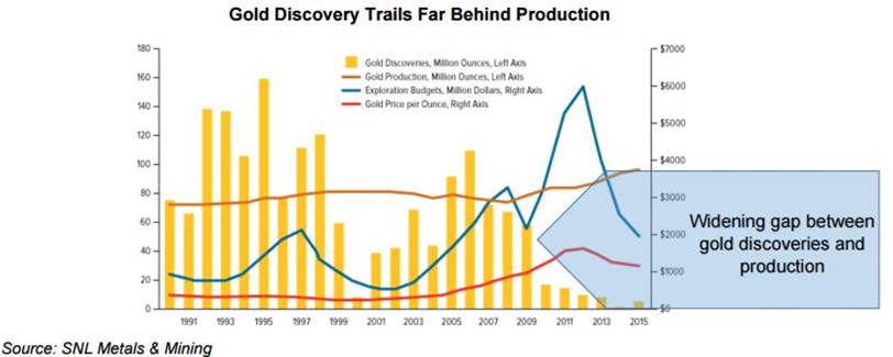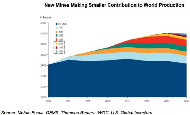 Mined peak gold production was expected in 2015. I’m going to suggest, with the help of the following charts, it might very well of been Q3, 2016.