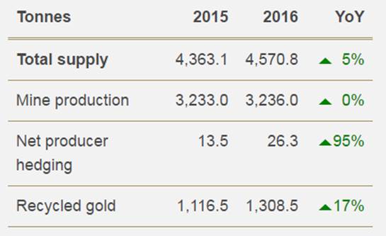 Mined gold totaled 3,236t in 2016, virtually unchanged from 2015