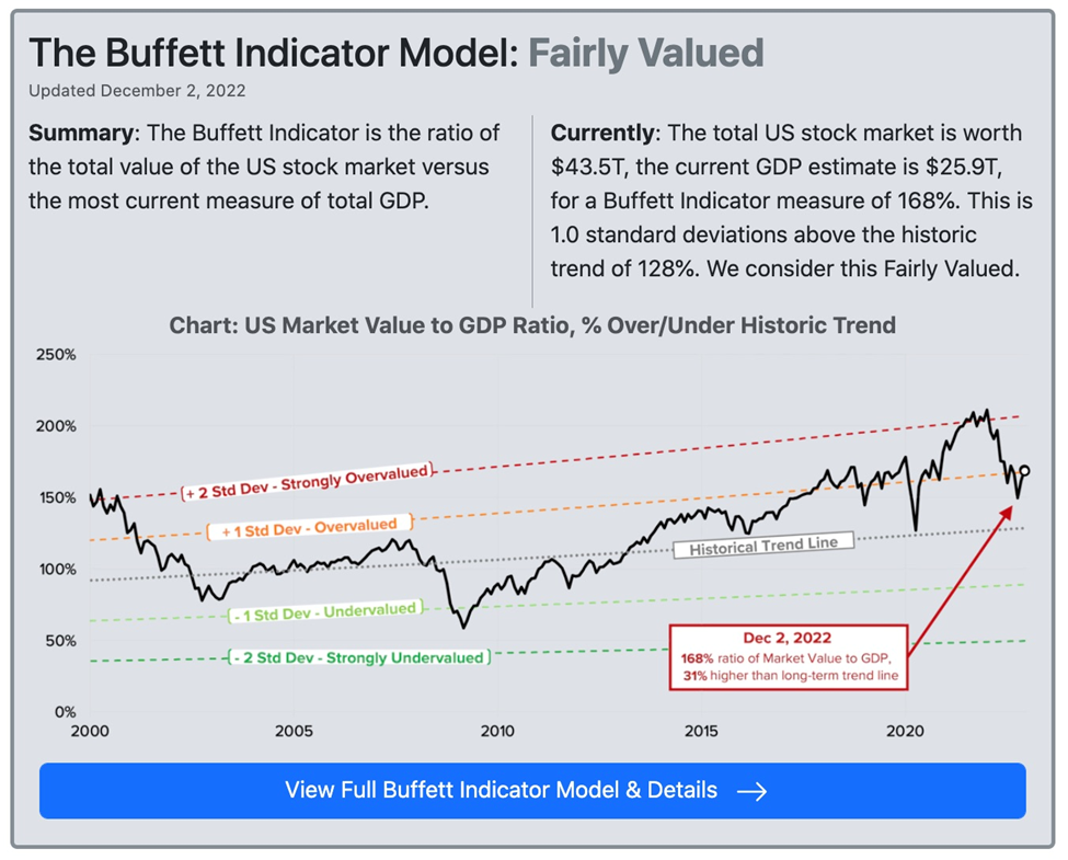 When markets swoon, many stockholders turn to Warren Buffett for investment advice. The “Buffett Indicator” is a valuation measure that compares the stock market’s capitalization to the Gross Domestic Product. The indicator currently sits at 168%, which is 31% higher than the current long-term trend line of 128%.