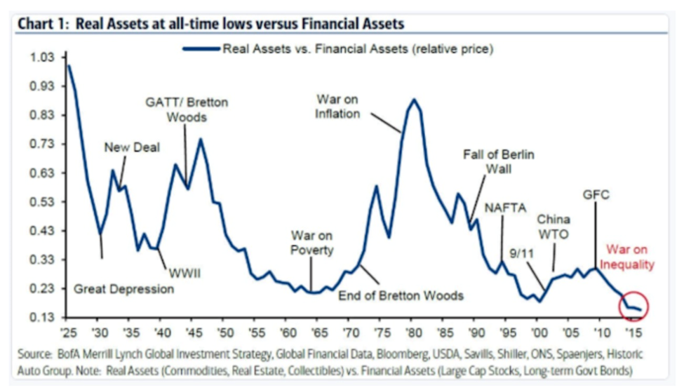 Real assets explode in relative value to financial assets, during periods of inflation and war. This makes sense because commodities are scarce, relative to money.