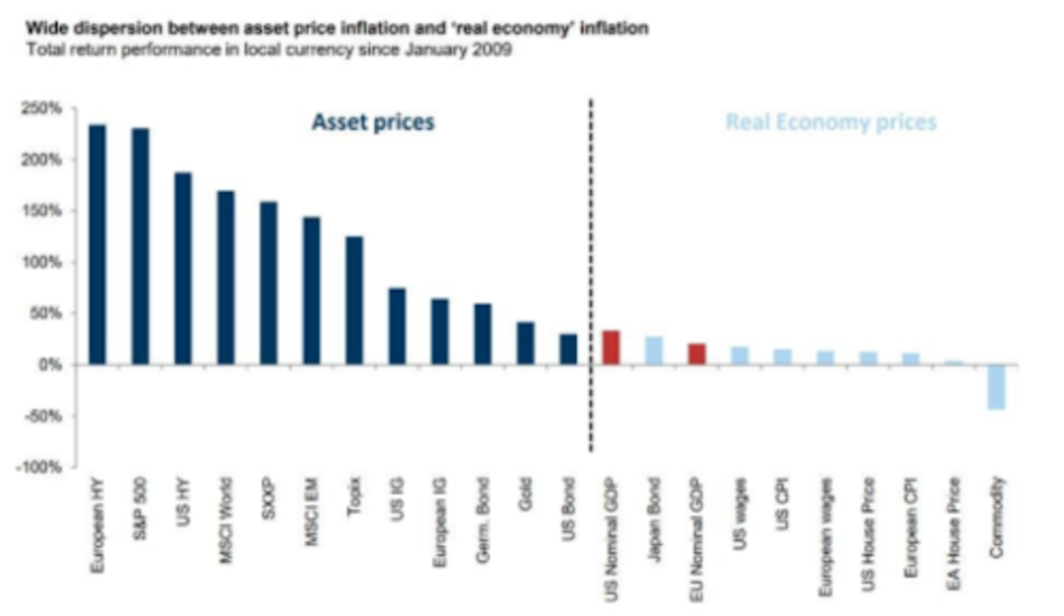 The chart below shows a wide dispersion between asset price inflation and real economy inflation. While real economy prices barely moved from 2009-18, asset prices exploded. Harvest states: The capital gains, dividends, or carry has favored these assets over investing in the real economy. Excess cash has used financial assets as a store of value. This is the collateral used for a levered economy.
