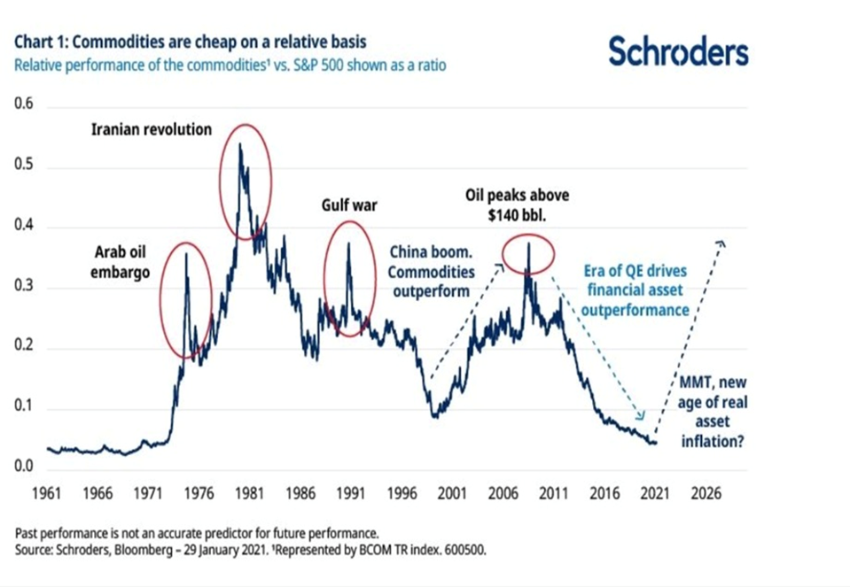 The following chart by Schroders is similar to G&R’s but tags key events at points in time when commodities have been overvalued.