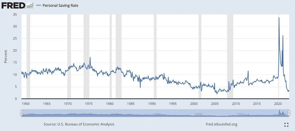 History suggests it is highly unlikely that households will continue to spend as they have recently. When the US savings rate dips below 3%, reduced spending is usually not too far behind. The graph below shows spending was as high as 8.7% in December, 2021, corresponding with the dissemination of covid stimulus checks. It has since fallen to 3.1% in September. In other words, we are on the verge of a consumer spending crash.