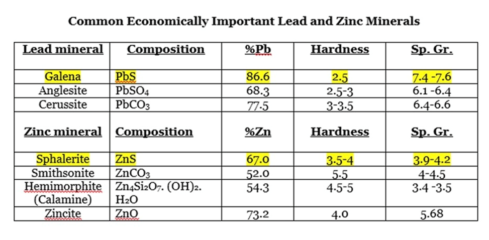 The most common lead mineral is galena, while for zinc, it’s sphalerite. Other occurring lead minerals are anglesite and cerussite. For zinc they are calamine, hemimorphite, zincite, willemite and franklinite.