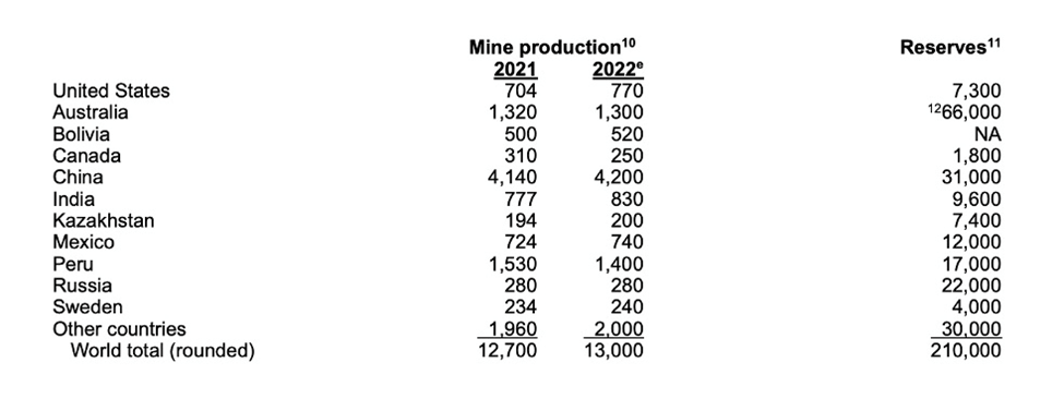 The USGS estimated 210Mt of zinc reserves in 2022, 40Mt less than in 2021, and global identified zinc resources of about 1.9 billion tons.