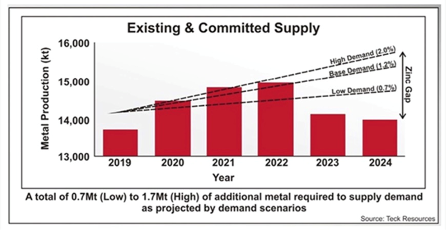 According to Lucintel.com, via the Globe and Mail, “The future of the zinc market looks promising with opportunities in the construction and infrastructure, transportation, consumer goods, and industrial machinery sectors. The global zinc market is expected to reach $74.4 billion in 2027. The major drivers for this market are increasing demand for galvanized steel and infrastructure development. Furthermore, growing demand from niche applications like smartphones, electric vehicles, mild hybrid engines, and power grid storage will drive the global zinc market.”
