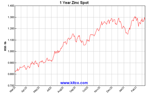 Indeed, zinc demand has already been on the rise over the past months as economies emerge from the pandemic looking to ramp up industrial activities. This was evident in the metal’s price movements: Following last March’s low of $0.83/lb, spot zinc went on a run and is now trading at around $1.30/lb, its highest in more than 18 months.